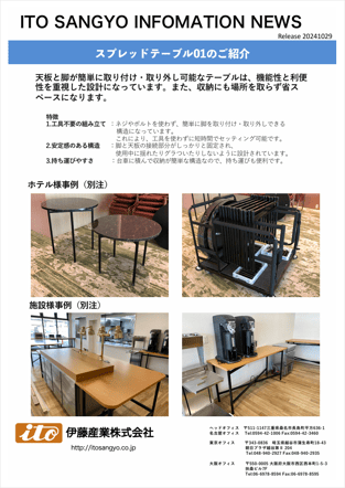 ホテル様でご好評いただいております、天板と脚が簡単に取り付け・取り外しが可能な「スプレッドテーブル01」をご紹介いたします。